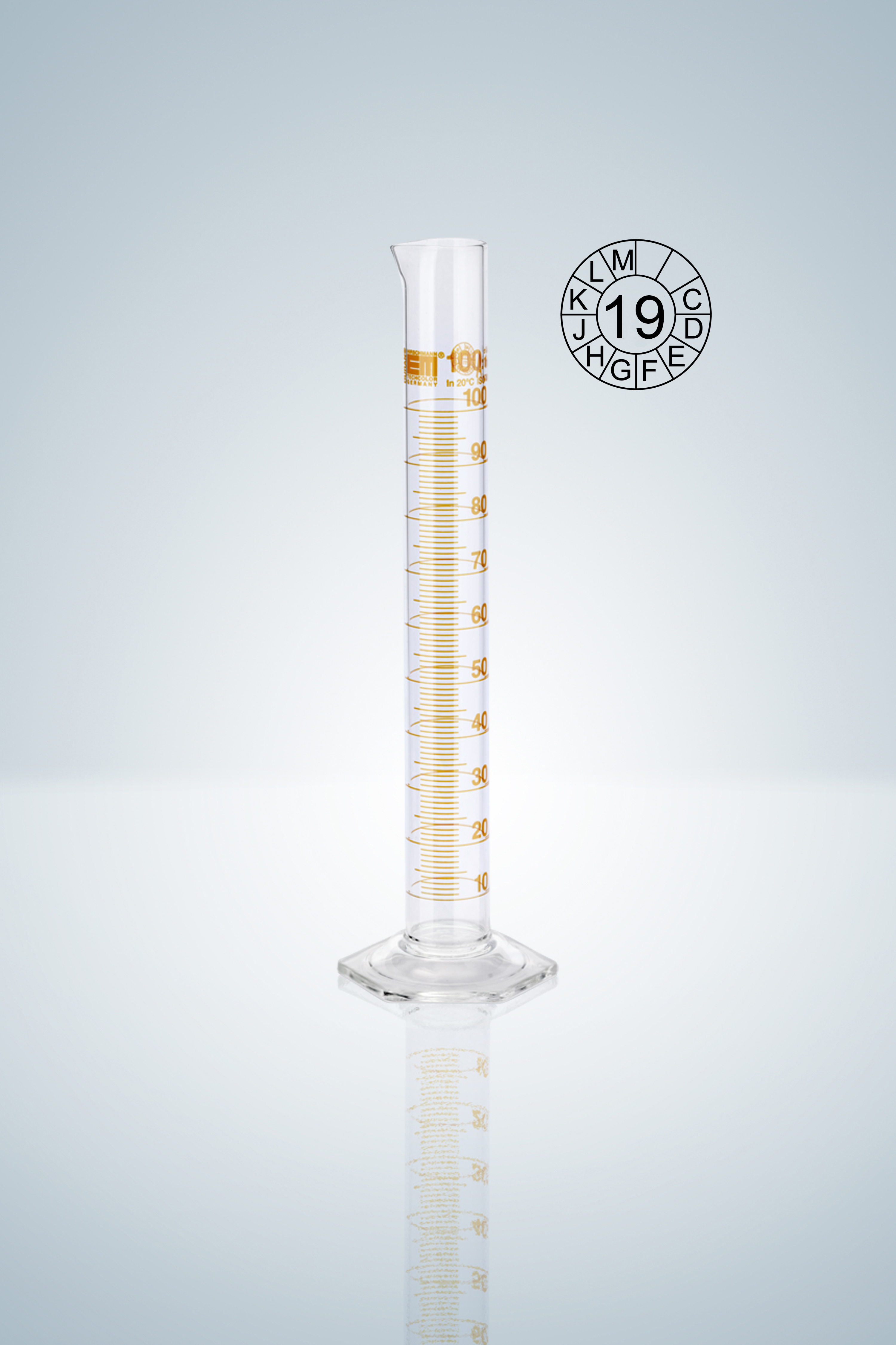 Probeta graduada DURAN®, Cl. A, graduación en ámbar, 100:1 ml, altura 260 mm, aforos anulares en puntos principales, con certificado de conformidad según DIN 12600, con distintivo fechado de lotes, DIN EN ISO 4788.