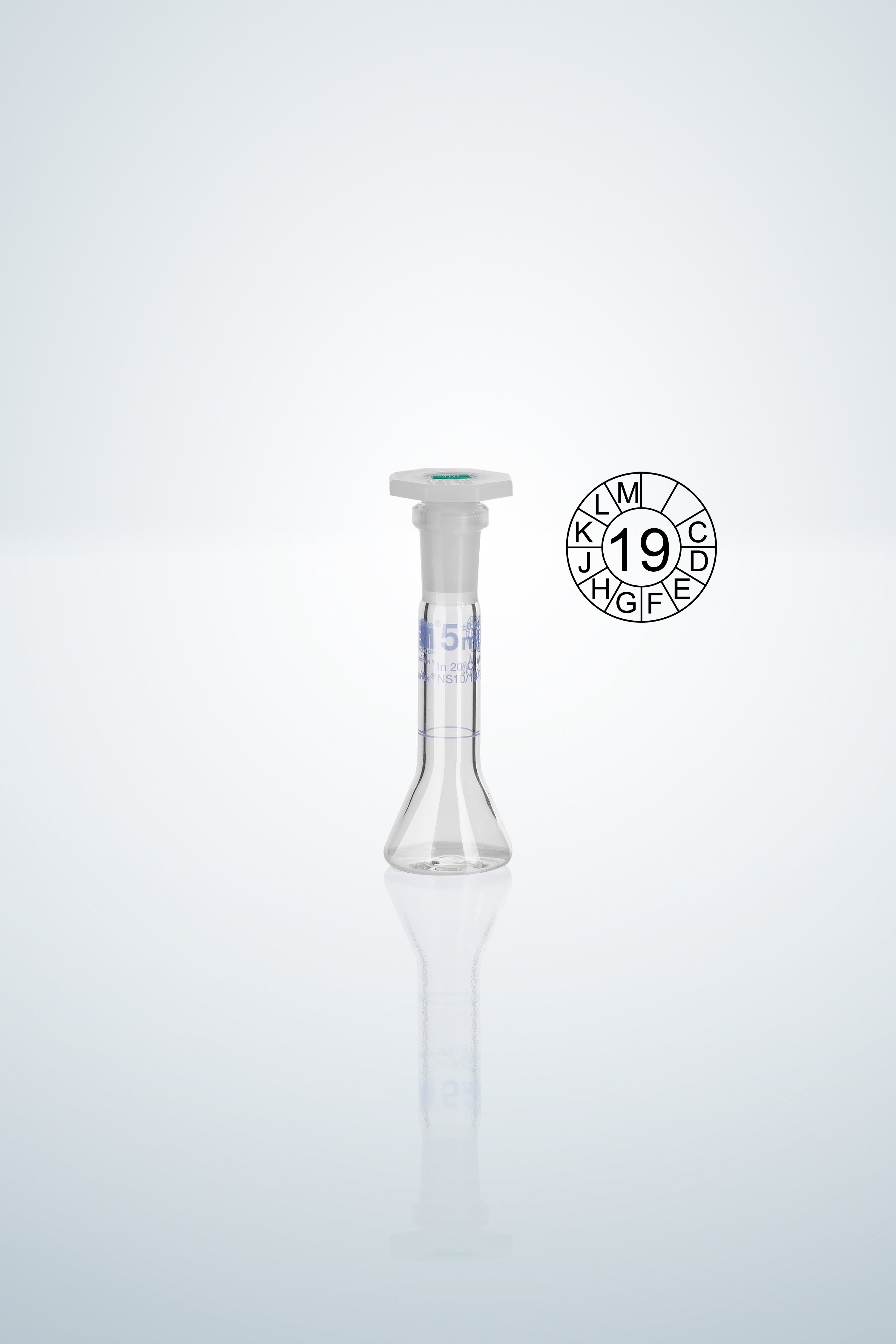 Matraz aforado DURAN®, Cl. A, graduación en azul, 5:0,04 ml, NS 10/19, altura 70 mm, forma trapezoidal, tapón PE, con certificado de conformidad según DIN 12600, con distintivo fechado de lotes, DIN EN ISO 1042.