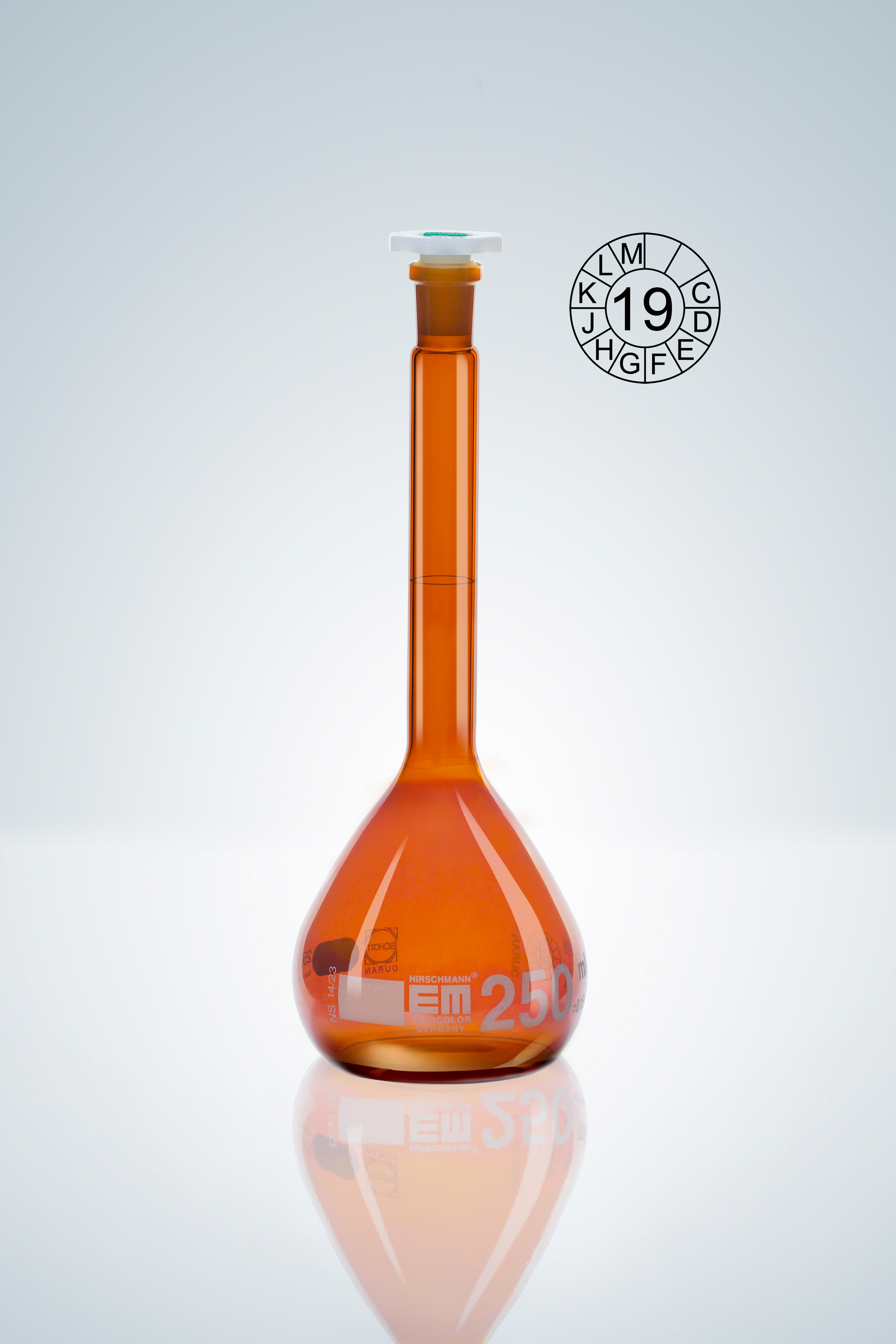 Matraz aforado DURAN®, Cl. A, vidrio ámbar, 250:0,15 ml, NS 14/23, altura 220 mm, tapón PE, con certificado de conformidad según DIN 12600, con distintivo fechado de lotes, DIN EN ISO 1042.