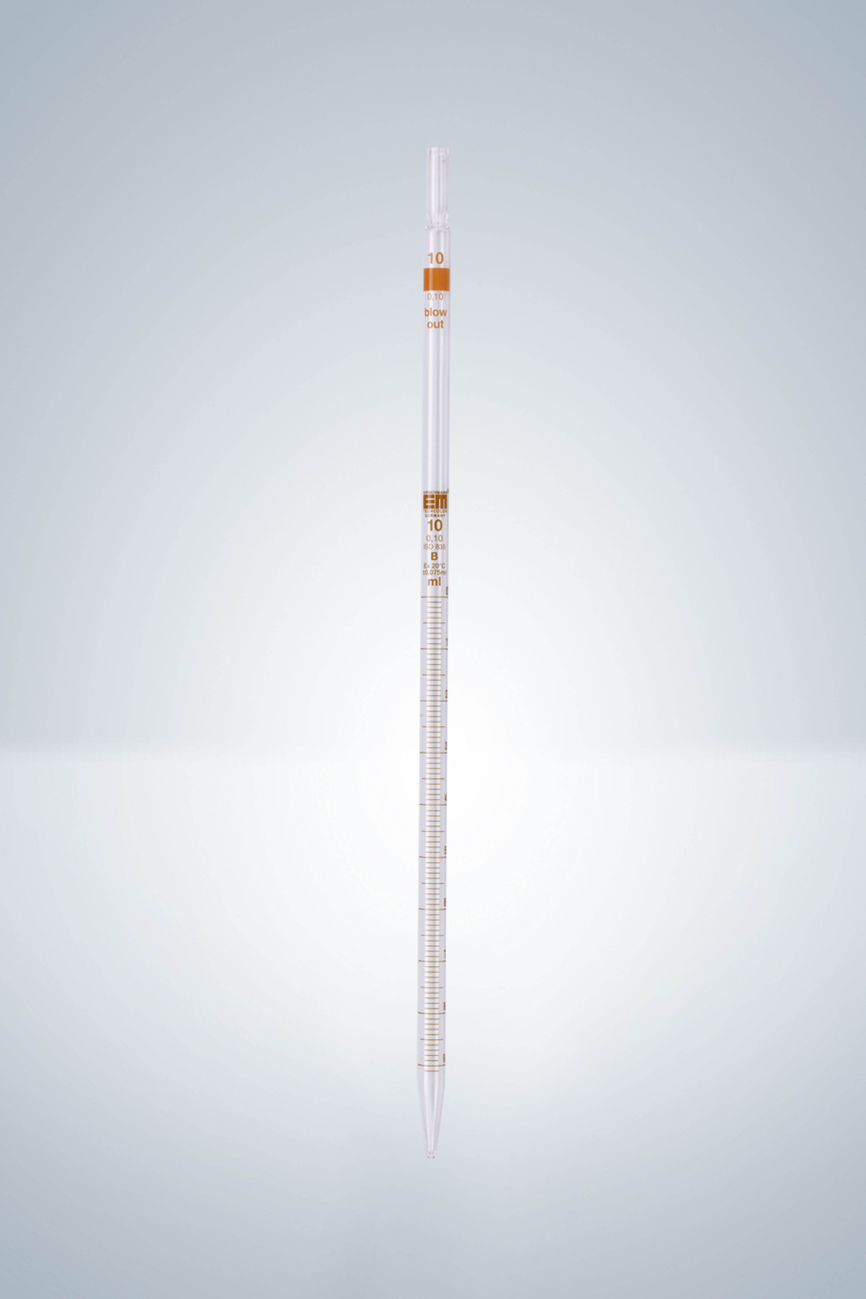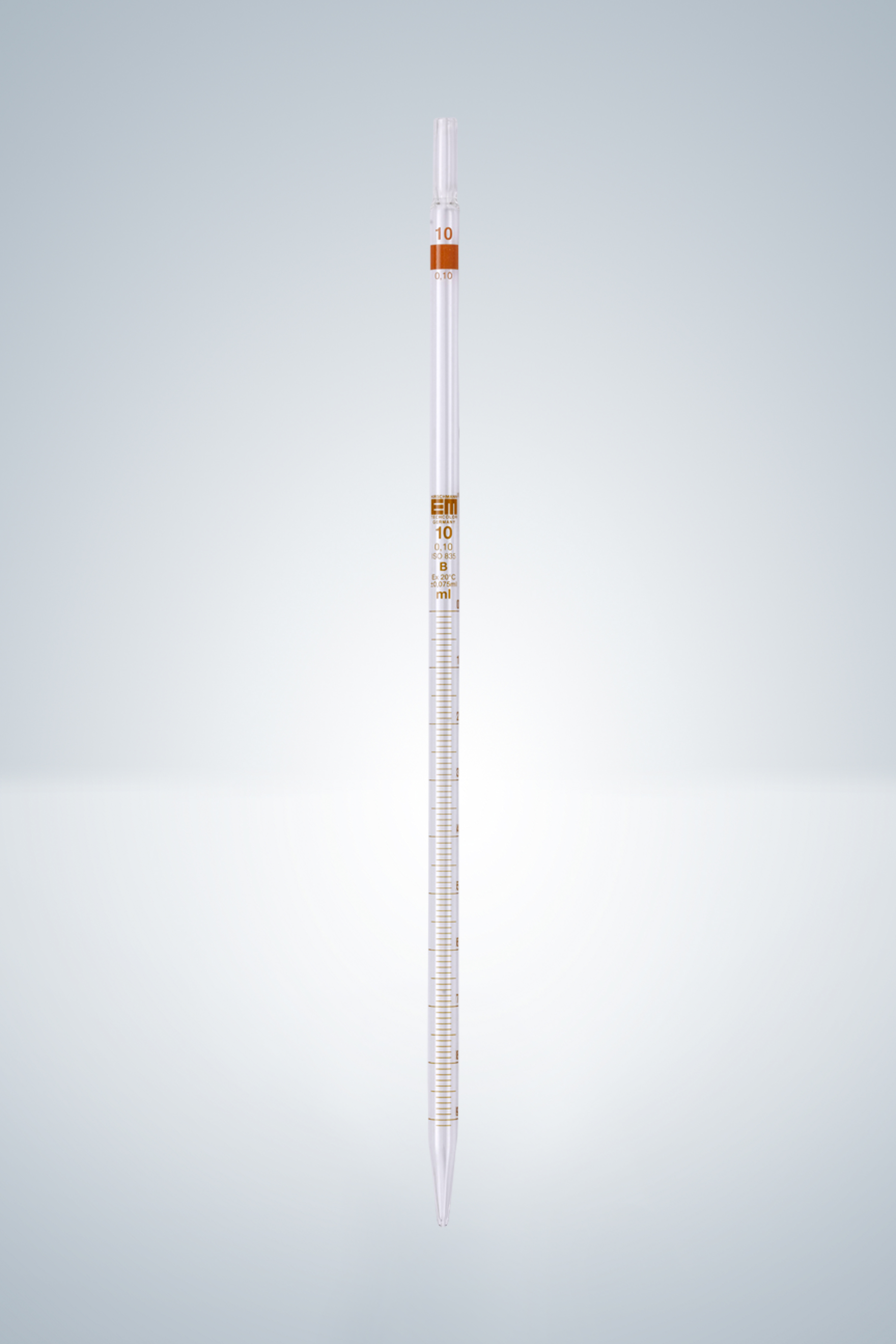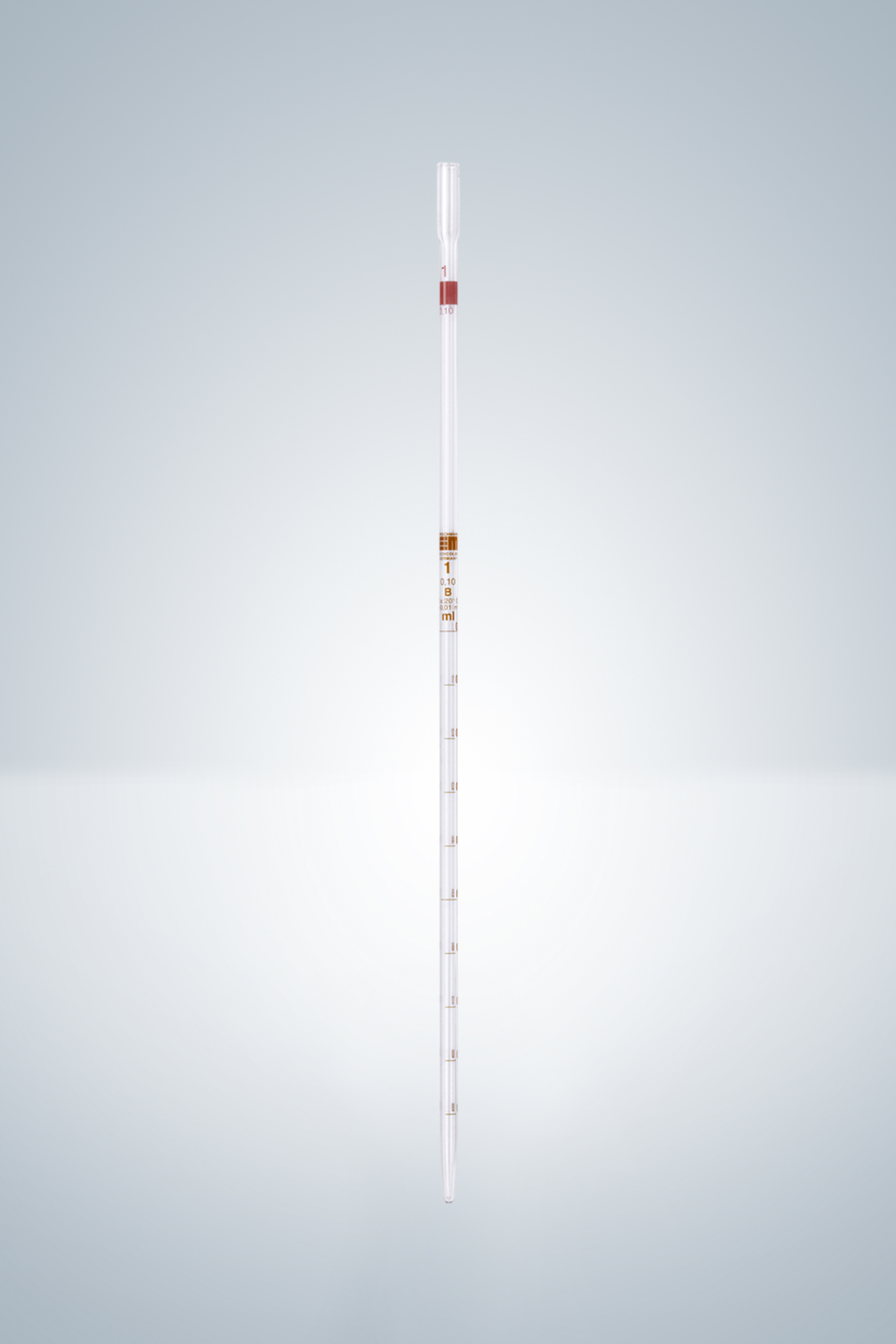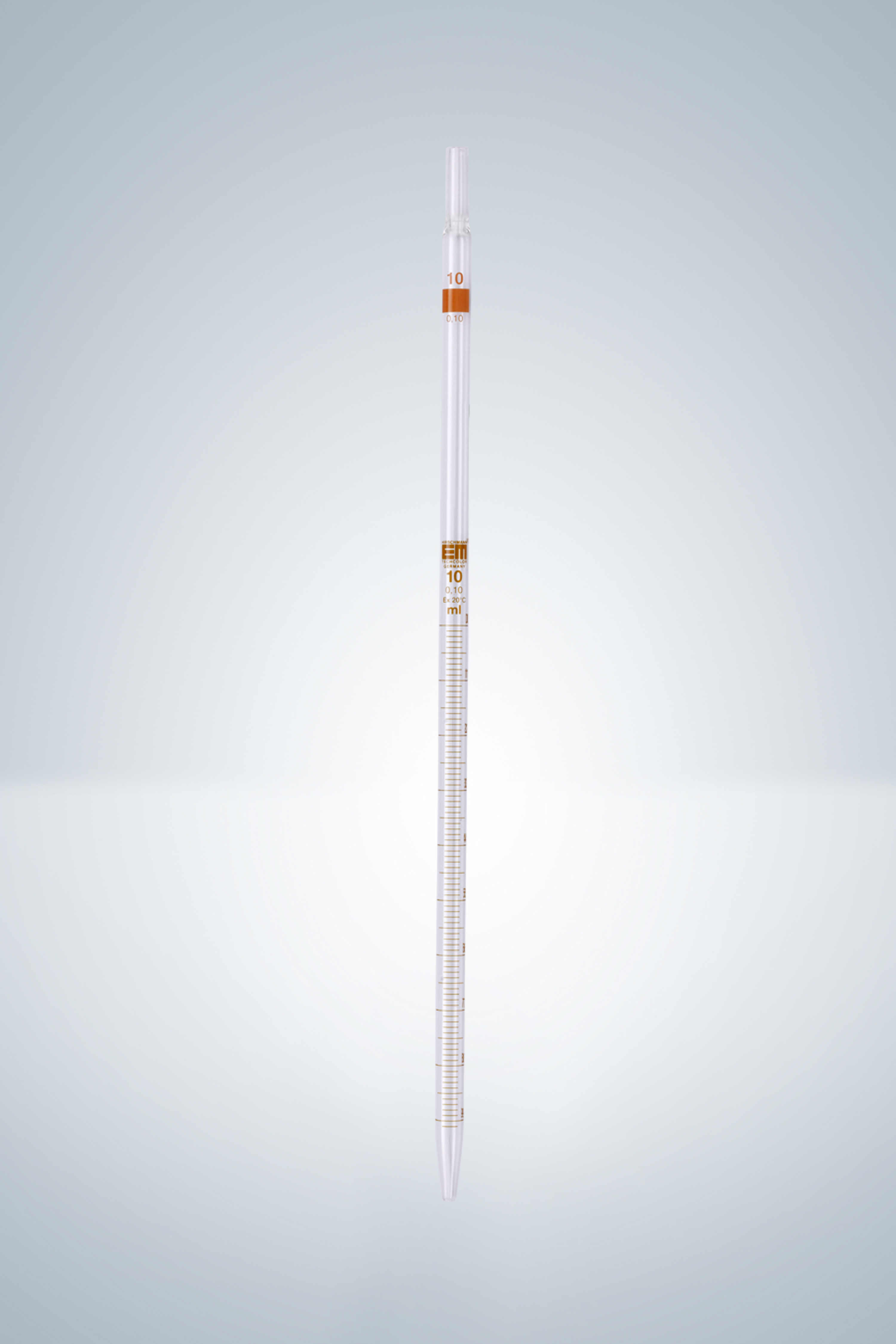 Pipeta graduada, Cl. B, graduación permanente en ámbar por difusión de plata, Vidrio sódico-cálcico.
