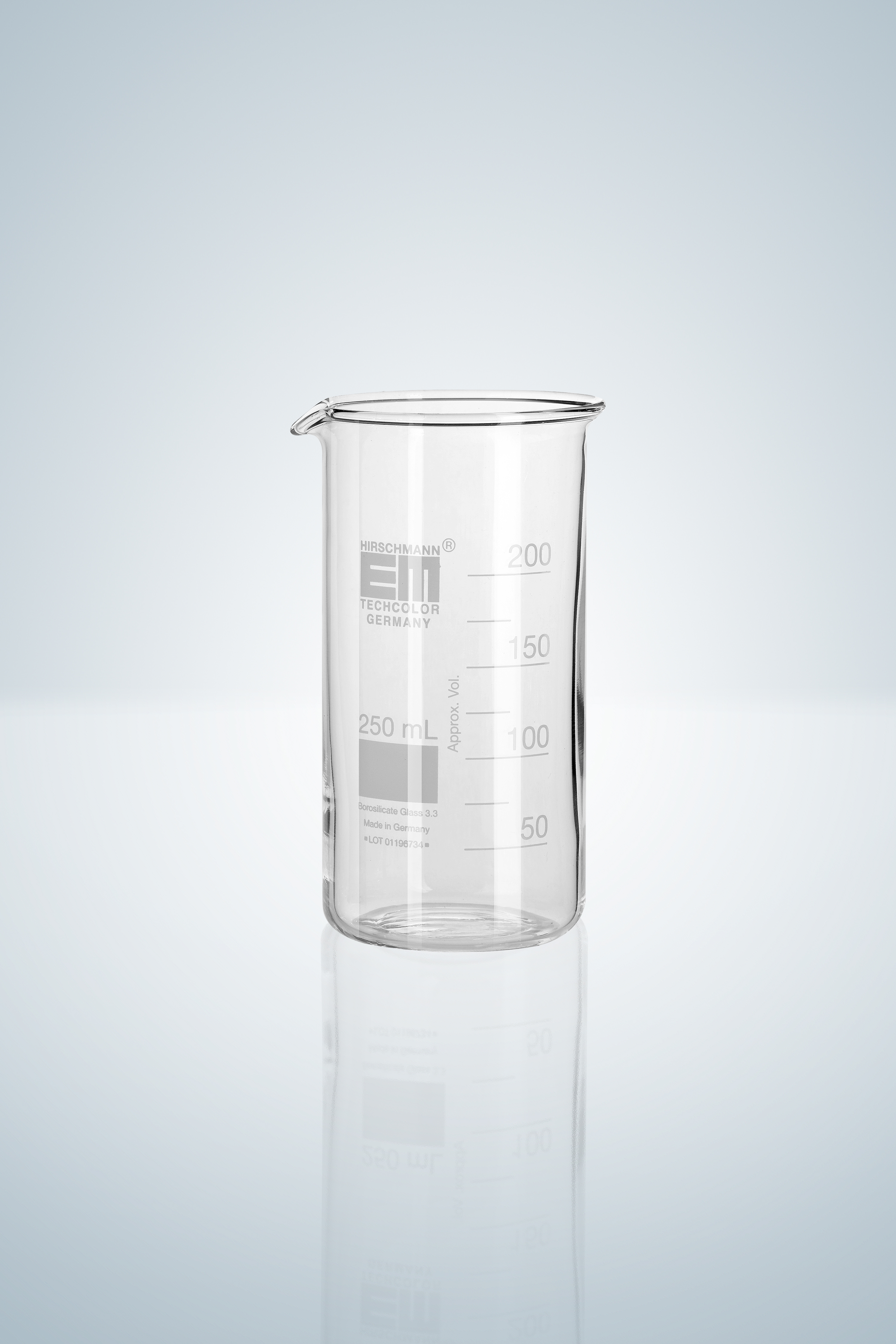 Vaso de precipitados, forma alta, graduación en blanco, 50 ml, altura 70 mm, diámetro exterior 38 mm, vidrio de borosilicato, con división y pico, DIN EN ISO 12331.